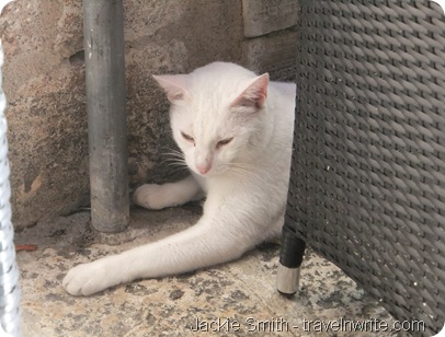 And signs in Arabic and English advise people to only feed them at the ‘feeding stations’ – these are two story structures that offer both food and drink. There was one well fed but camera-shy cat behind the structure just waiting to eat a bit more as soon as I left: